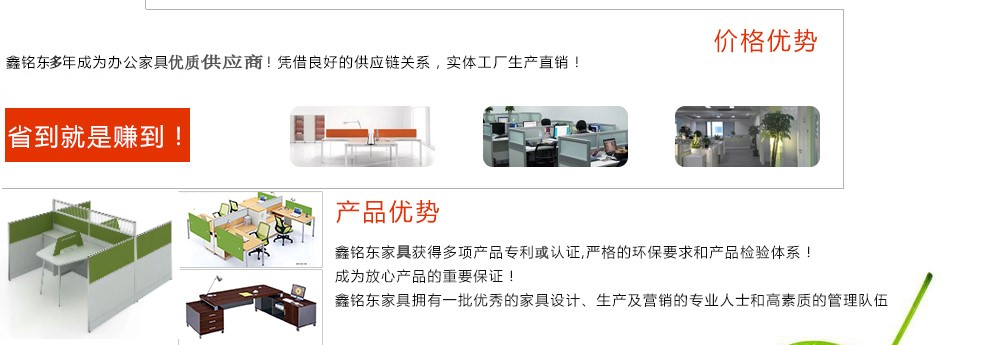 深圳市鑫銘東家具有限公司深圳市鑫銘東家具有限公司專業(yè)銷售各類辦公家具!產(chǎn)品涉及多種系列,如:班臺、班椅、屏風(fēng)、會議桌、會議椅、辦公沙發(fā)、茶幾、辦公桌、文件柜、電腦桌椅、各式餐臺、餐椅、書柜等辦公家具。 鑫銘東家具擁有一批優(yōu)秀的家具設(shè)計(jì)、生產(chǎn)及營銷的專業(yè)人士和高素質(zhì)的管理隊(duì)伍。銘東家具以"先難后易"之戰(zhàn)略,在產(chǎn)品結(jié)構(gòu)、產(chǎn)品質(zhì)量及服務(wù)水平方面,均推陳出新,力求完善,精益求精。使我們的產(chǎn)品質(zhì)量保持在國內(nèi)外家具潮流的先進(jìn)水平,力求滿足客戶的特殊需求。鑫銘東家具多年來致力于環(huán)保、實(shí)用家具的設(shè)計(jì)與開發(fā),集生產(chǎn)、銷售、服務(wù)于一體。本著"以人為本"的設(shè)計(jì)理念,大量開發(fā)符合人體工程學(xué)的各種產(chǎn)品,以"誠信為本"的質(zhì)量方針,真材實(shí)料,認(rèn)認(rèn)真真做產(chǎn)品,實(shí)實(shí)在在做人。鑫銘東家具更致力于創(chuàng)造"零維修率"的制造境界,實(shí)現(xiàn)"沒有維修的服務(wù)才是最好服務(wù)"的口號》了解更多 |